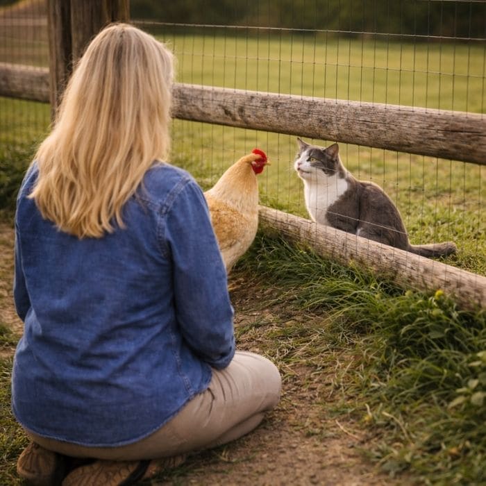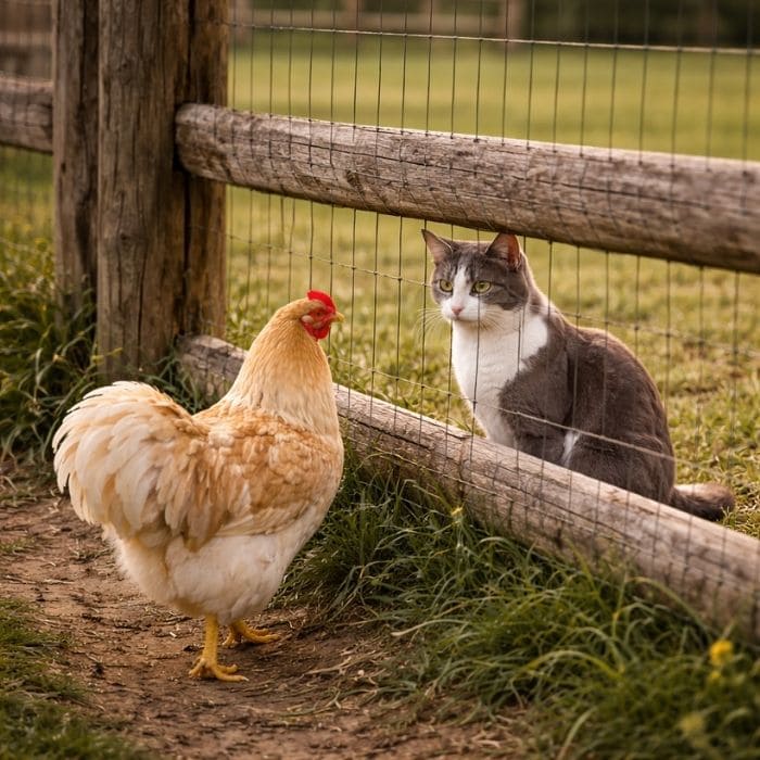 Juniper stopped a short distance from the fence and tilted her head slightly, the way chickens do when they’re trying to understand something new. Lucy lowered herself to the ground, not crouching to pounce, but settling, her tail wrapped loosely around her body.