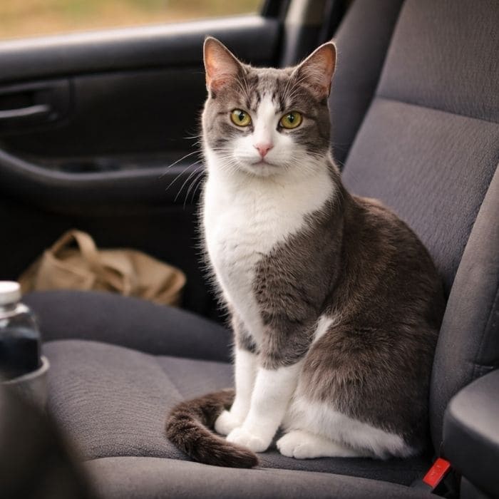 She’s a medium-sized cat, lean rather than bulky, with a soft gray-and-white coat and a long tail that curves gently at the tip. Her movements are smooth and careful, never rushed, and her eyes are a pale green that seem to take in everything at once.