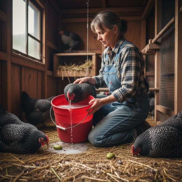 I flushed the waterers and refilled them with clean water, adding electrolytes to support hydration and recovery.