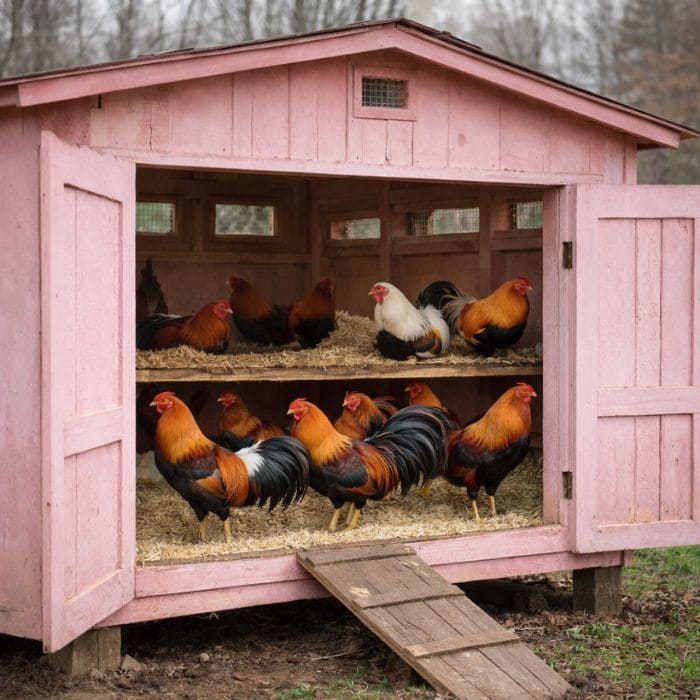 Inside, the roosts are lower and wider to support their bodies. Ventilation is carefully balanced because their thick feathers hold heat differently.