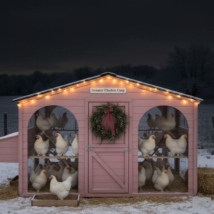 By noon, the Sweater coop looked like it belonged in a quiet winter story. Pink walls softened by greenery, gentle light catching the edges, and chickens moving in and out without concern.
